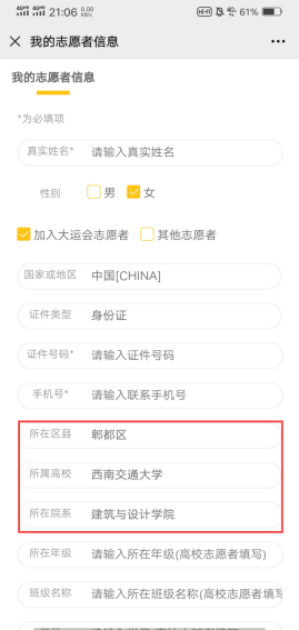 步骤三:填写我的志愿者信息。注:所在区县“郫都区”,所属高校“新葡的京集团350vip8888”,所在院系“建筑与设计学院”。全部填写完成后点击最下方“提交”。